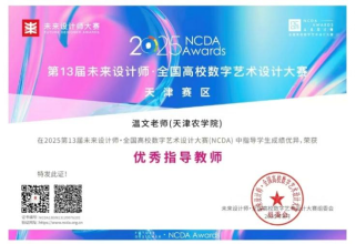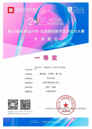 近日,第13届未来设计师·全国高校数字艺术设计大赛(NCDA)天津赛区评选结果正式揭晓。天津农学院园艺园林学院再传捷报,环境设计专业2023级学生韩亚鹏、于博成、唐一歌,在指导教师温文、张俊老师的悉心指导下凭借作品《遗态万千,织智延年--织造乡村主题设计》,成功斩获天津赛区一等奖。
