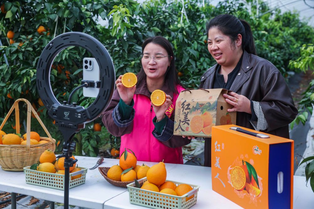 2025年12月4日,在浙江省长兴县和平镇东山村四季鲜果家庭农场,当地青年志愿者为农户直播带货,销售红美人柑橘。新华社记者 徐昱 摄