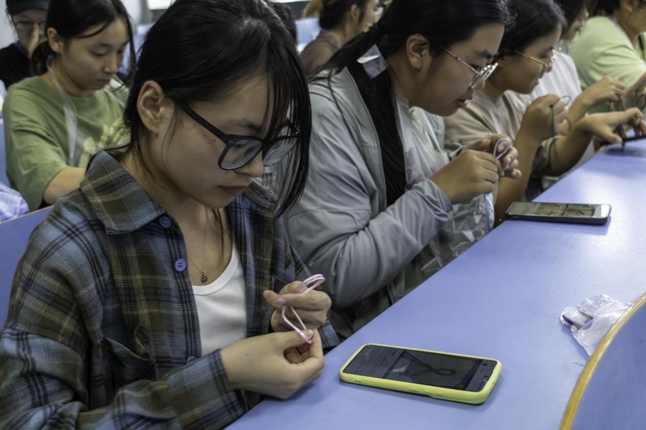 巧手编织同心结:编织中国结活动场地格外安静而专注。学生们跟随指导学习“平结”“双联结”手指翻飞,一根根红绳逐渐变成了象征吉祥团结的中国结。这不仅是一次手工体验,更是一次文化传承,寓意着各族人民手牵手、心连心。